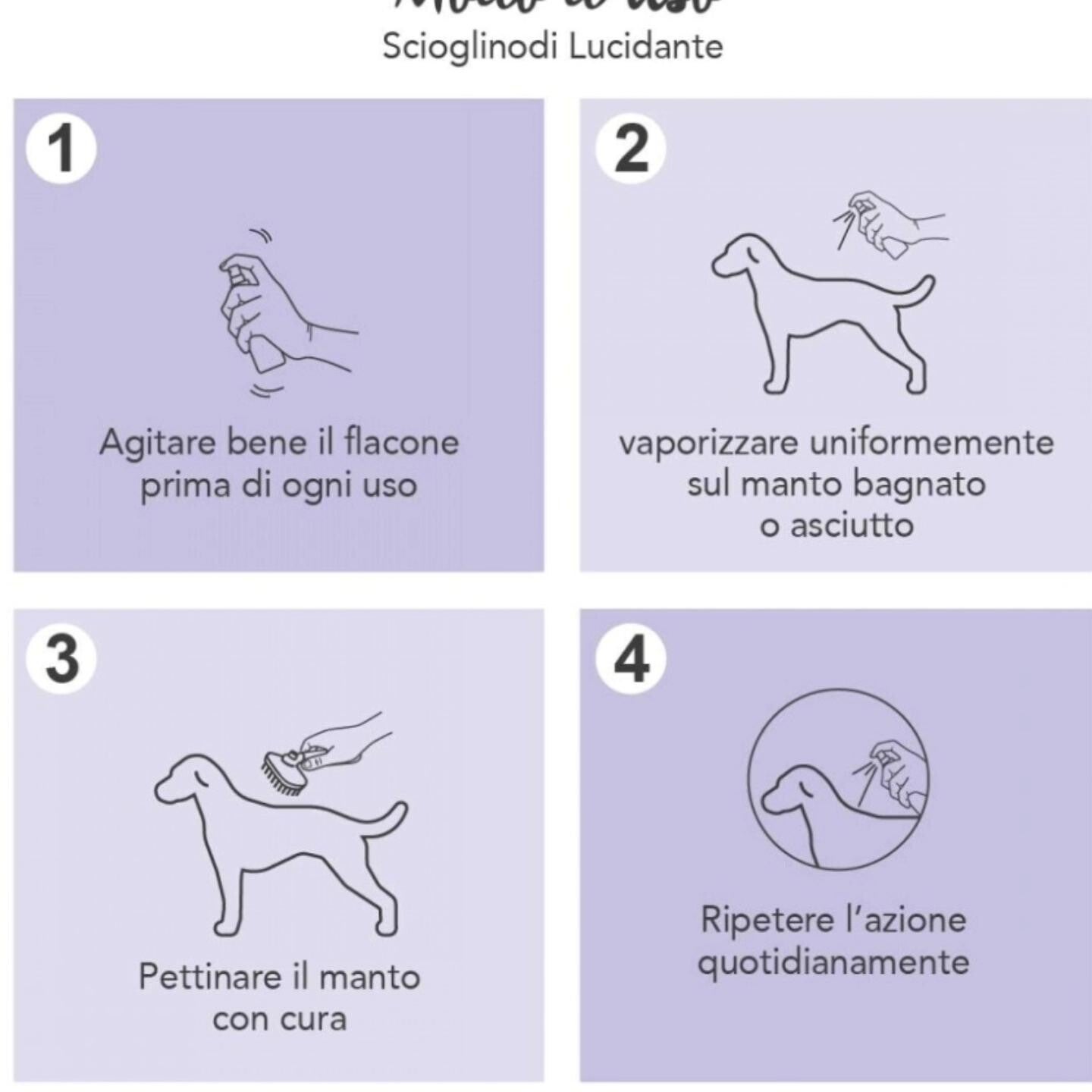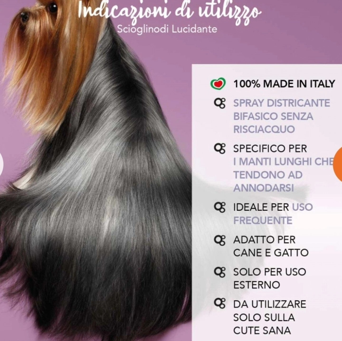 Se ti stai chiedendo se si può usare sui manti rasi, la risposta è assolutamente sì, perché il prodotto oltre all'azione districante vanta anche un’azione lucidante e ammorbidente, grazie agli ingredienti specifici e agli estratti botanici di altissima qualità.