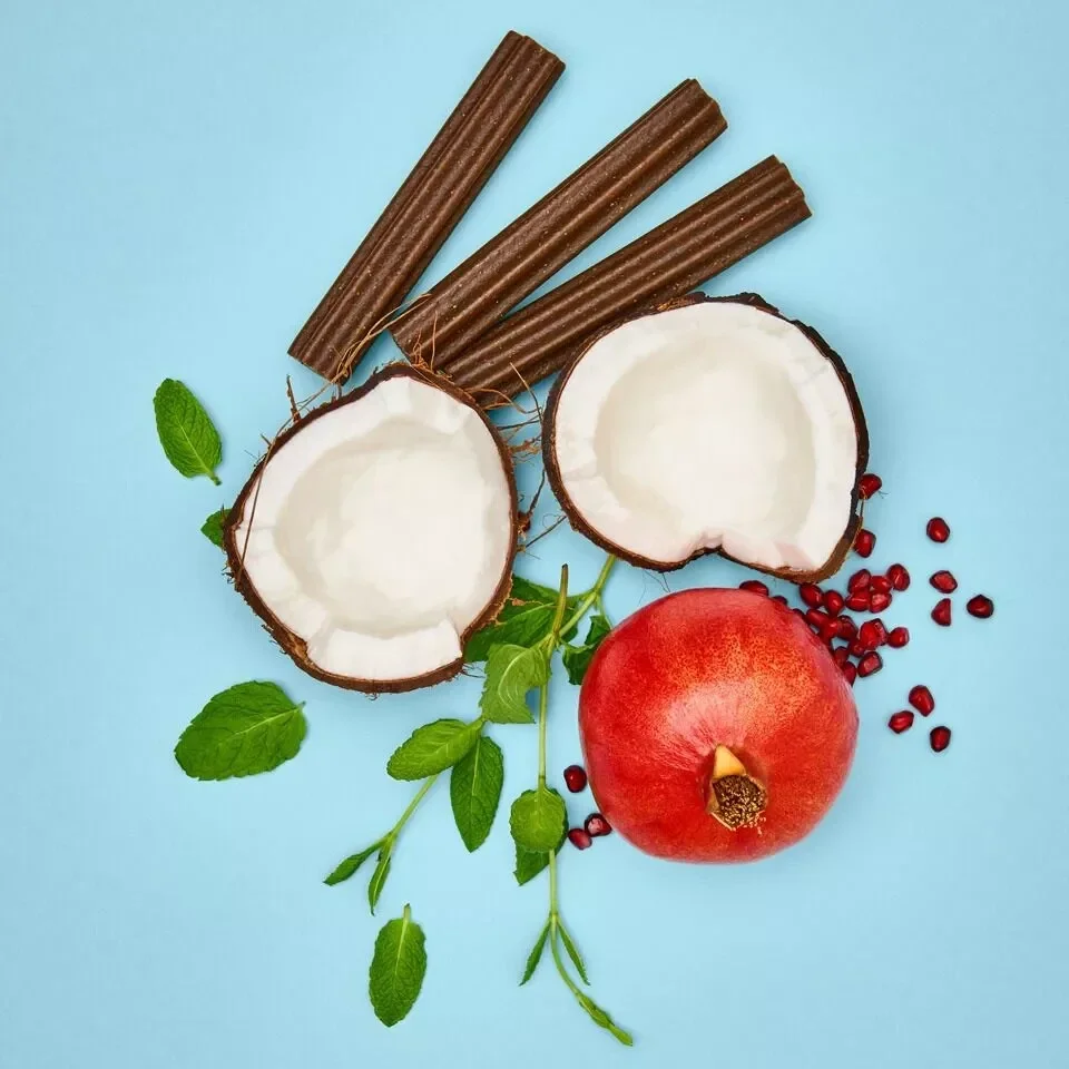 fecola di patate, fecola di patate, carni di pollame 20 % (fresche/congelate), glicerina vegetale, cellulosa, minerali (tra cui esametafosfato di sodio 0,6%), alghe marine, melograno 0,3 %, cicoria 0,1 % (fonte naturale di inulina), MOS 0,1 %, olio di cocco 0,1 %, aloe vera. Aromatizzante: olio di menta piperita 480 mg / kg.