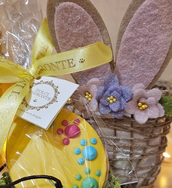 Biscotto in pasta frolla, decorato a mano in colore giallo con quattro simpatiche zampine colorate.