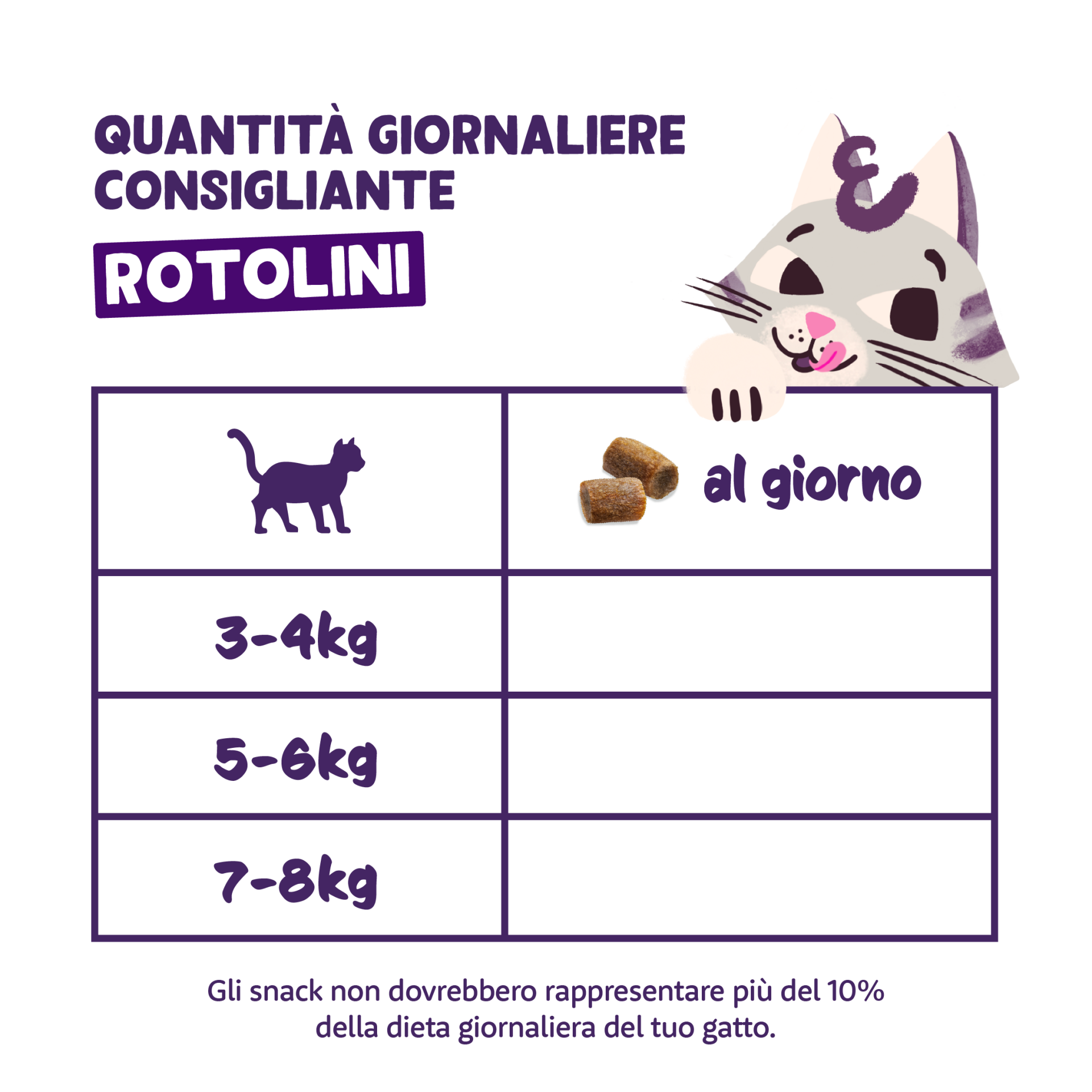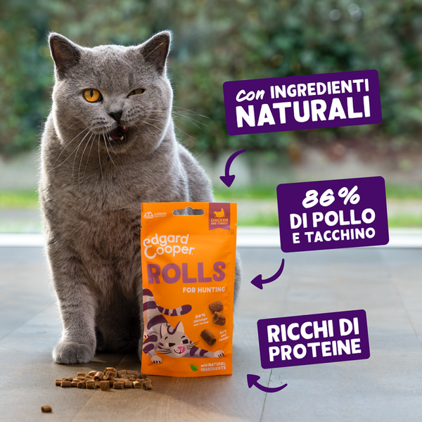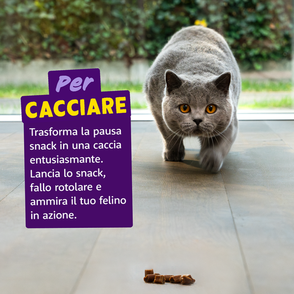 Trasforma la pausa snack in una caccia entusiasmante con i nostri irresistibili Rotolini. Lanciali, falli rotolare e ammira il vero istinto da cacciatore del tuo gatto. In alternativa, offriglieli dopo una sessione di gioco per mantenerlo attivo e impegnato.