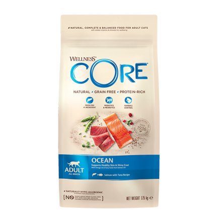 L'alimento completo Wellness Core Adult Ocean con Salmone e Tonno per Gatti è preparato per gatti adulti a partire da 1 anno di età.