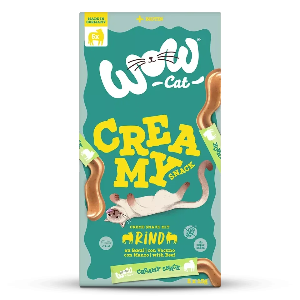 La strada per il cuore di un gatto passa per il suo stomaco - preferibilmente con lo snack cremoso WOW. Ideale per le coccole ad alto gradimento. Da leccare direttamente dalla bustina, dalla ciotola o come guarnizione del cibo