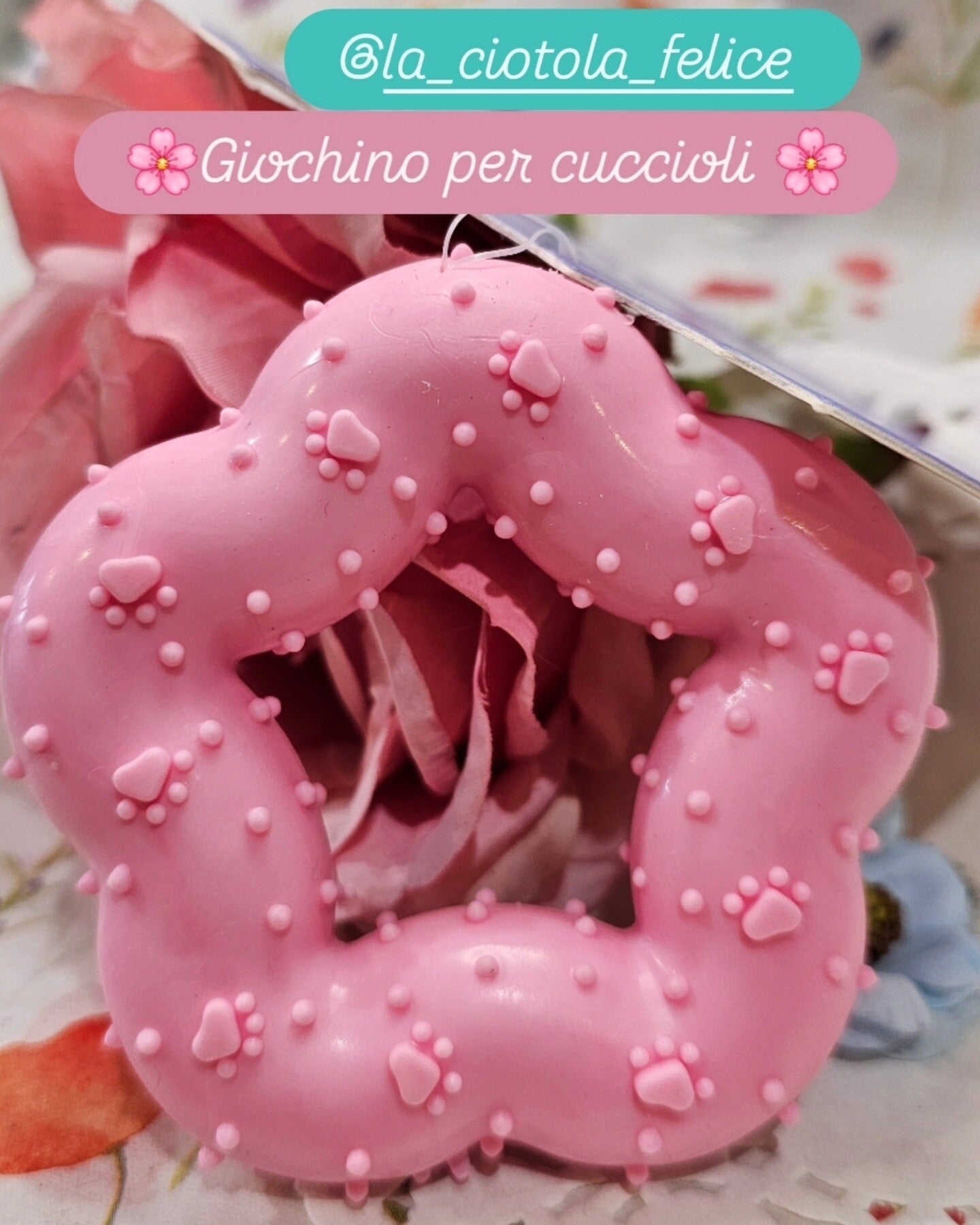 Gioco da mordere per cani, della linea Primi Morsi realizzato in TPR, solido e resistente ai morsi, ma delicato per le gengive dei cuccioli. Con piccoli rilievi che stimolano il cane alla masticazione. La corda stimola invece al tira e molla, in una versione iniziale delicata per i cuccioli. Il design e i colori delicati donano un tenero effetto cucciolo al giocattolo - 9 cm -