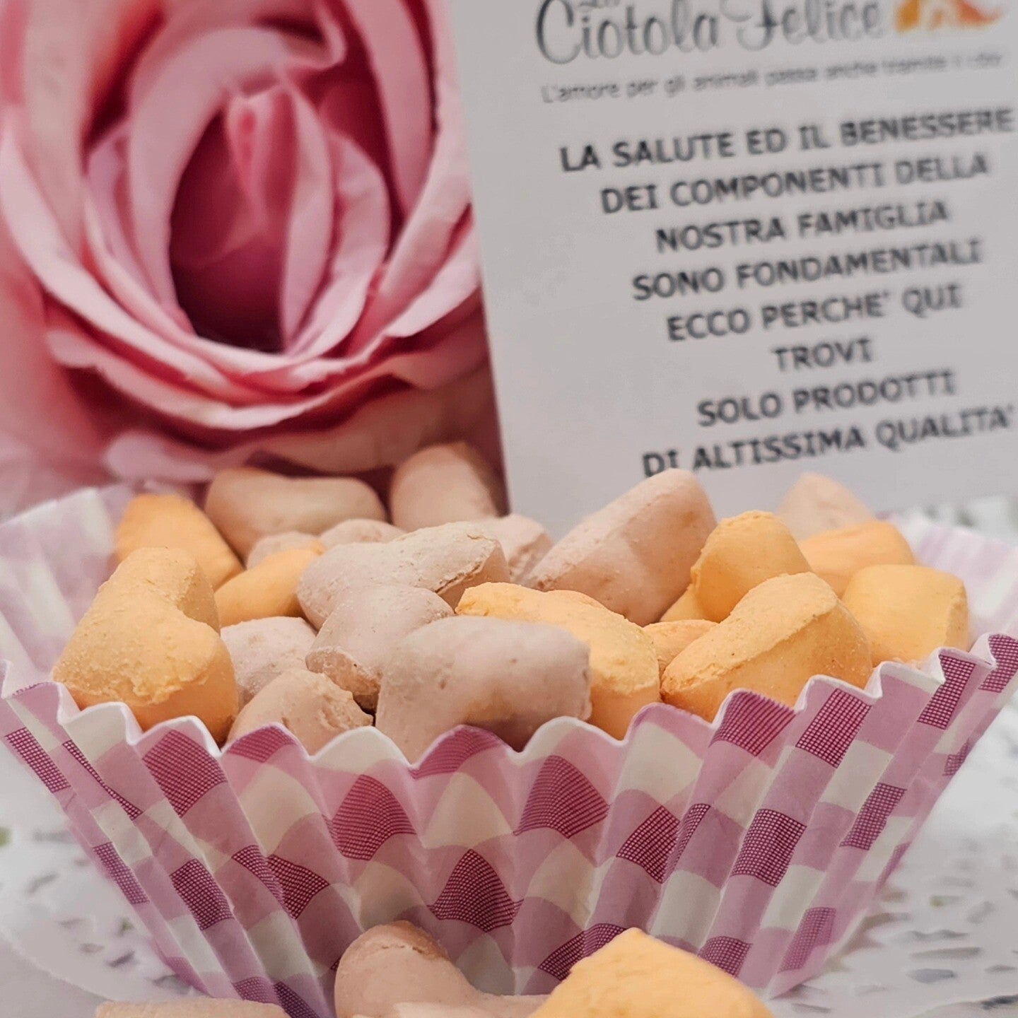 I biscotti da forno per cani, sono degli snack ideali, sfruttabili anche come ricompensa o premio, a base di ingredienti totalmente naturali e vegetali, quali fragola e melissa. La fragola apporta vitamine e sali minerali indispensabili, oltre a garantire un sapore goloso ai biscotti, mentre la melissa apporta sostanze fondamentali per il mantenimento del buono stato di salute di cute e mantello.