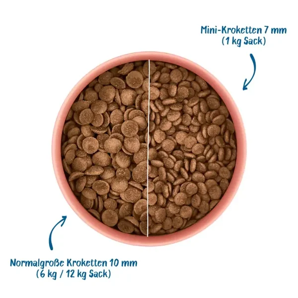 - Dimensione delle crocchette: Normale (12 mm) in sacchi da 6/12 kg, Mini (8 mm) anche per i cani più piccoli in sacchi da 1 kg.